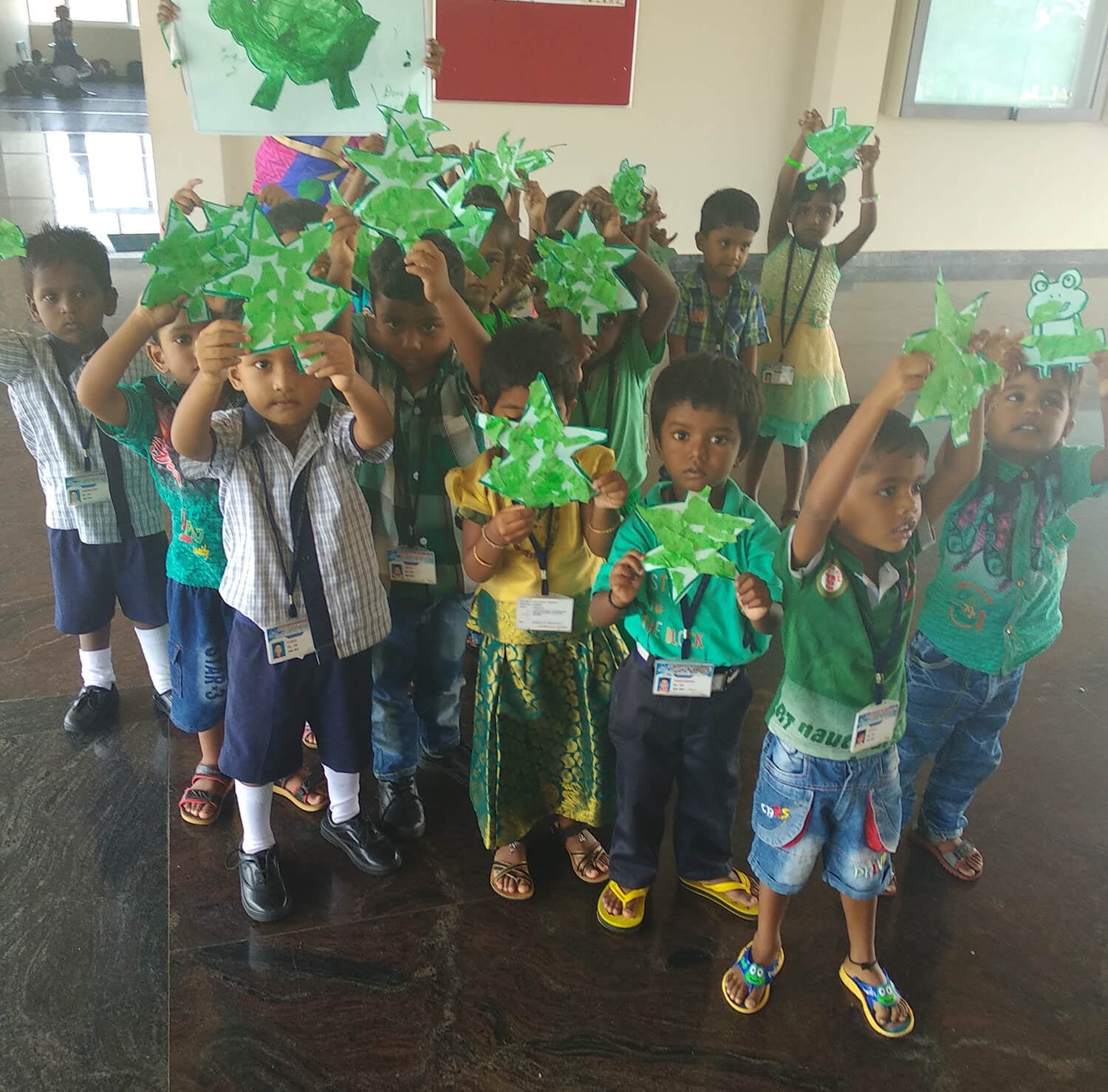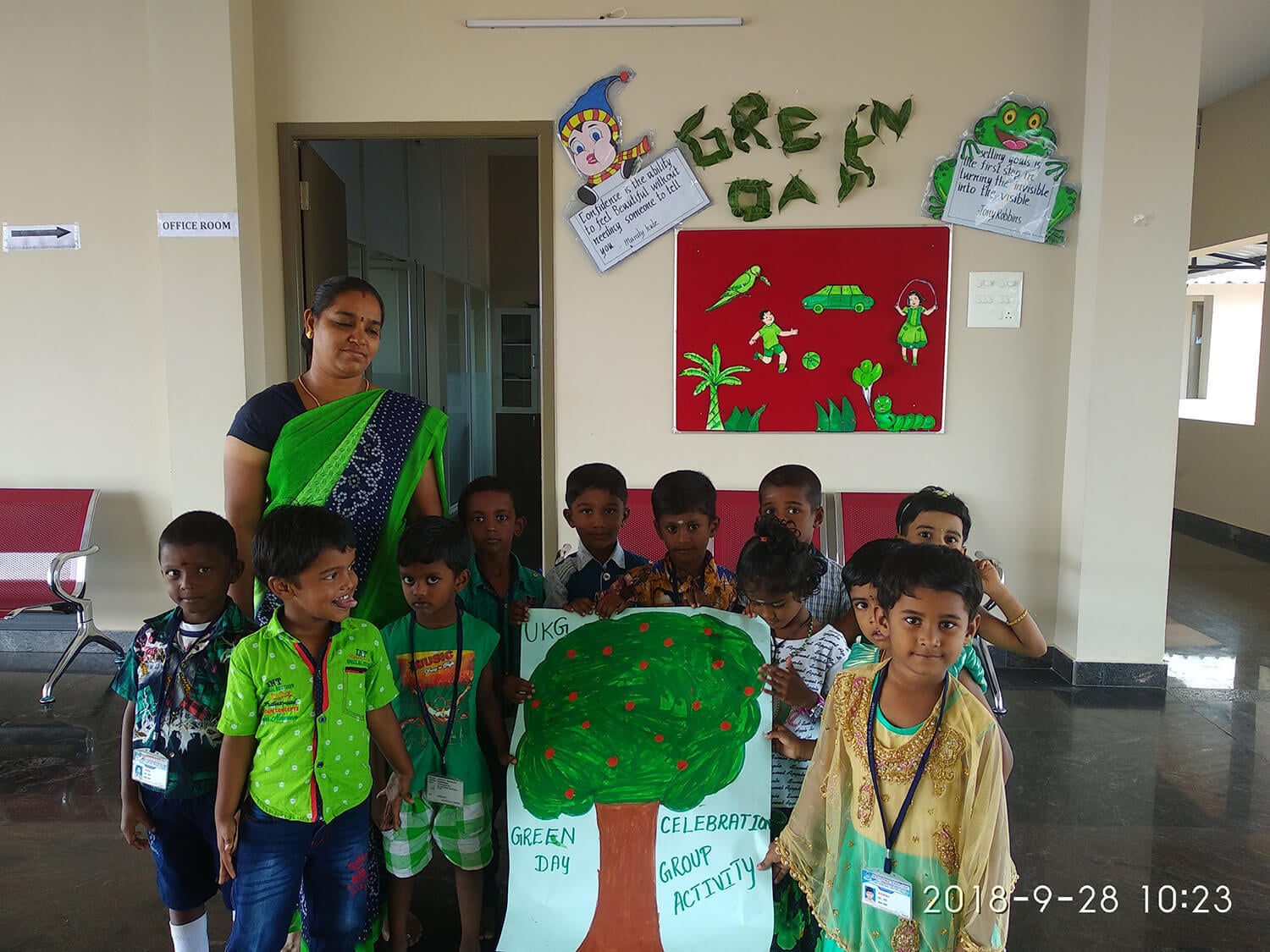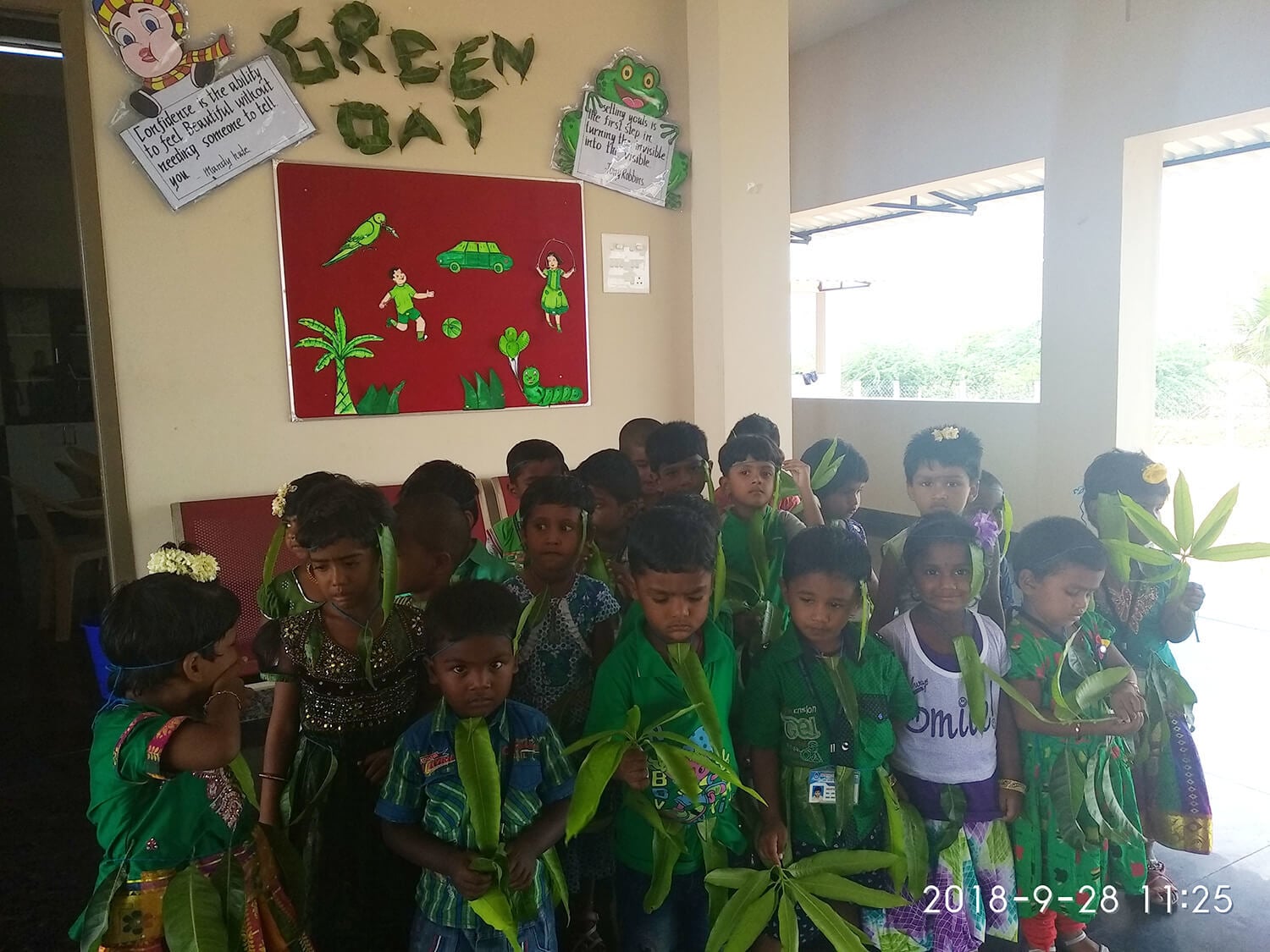Green symbolizes self-respect and well being. It also means learning, growth and harmony. It's the symbol of prosperity, freshness, and progress. The significance of the colour was reiterated as students and teachers of Kinder Garten were dressed in green colour.